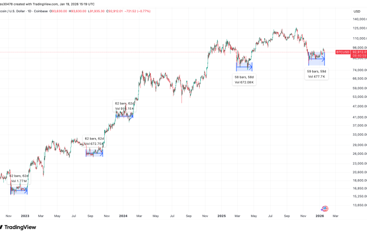 BTC price consolidation nears 60-day timespan that’s historically triggered rallies