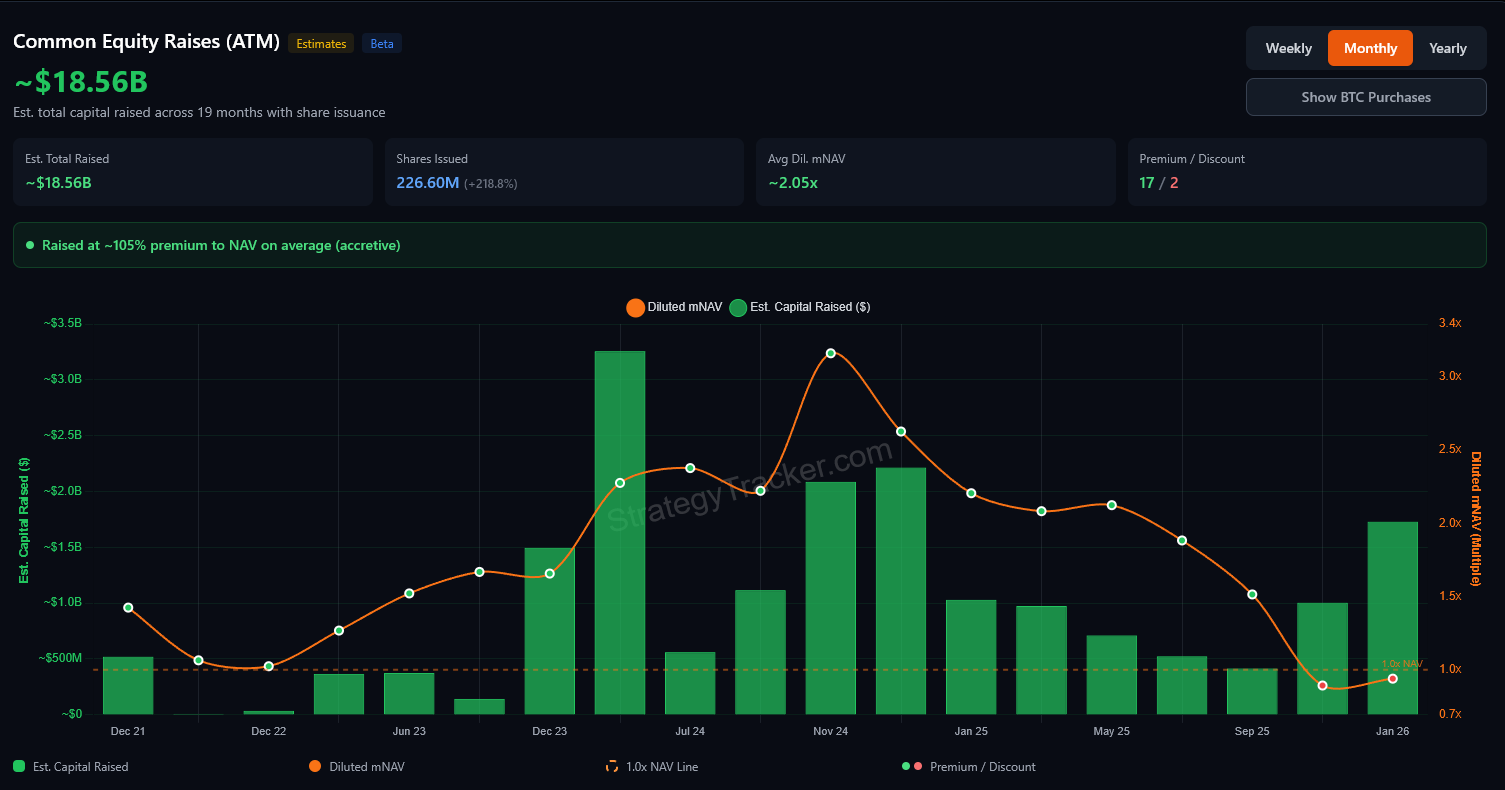 If the stock remains below net asset value, further equity issuance would mathematically reduce Bitcoin exposure per share.