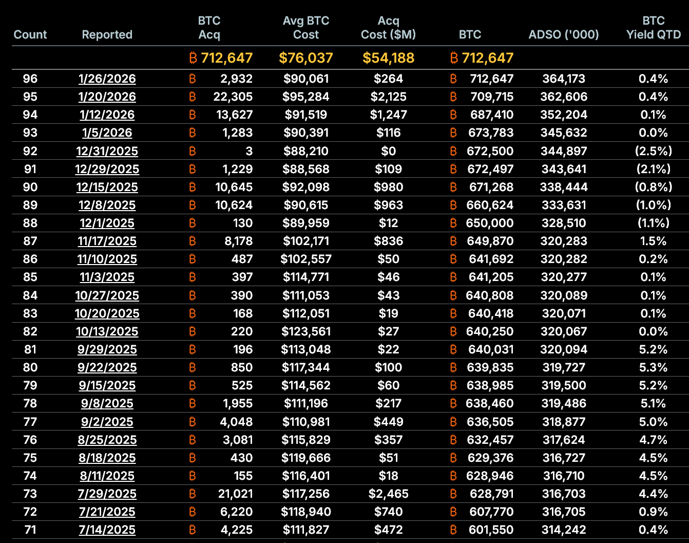 - By January 26, holdings rose to 712,647 BTC, but diluted shares climbed to 364.2 million, resulting in 0.001957 BTC per share.