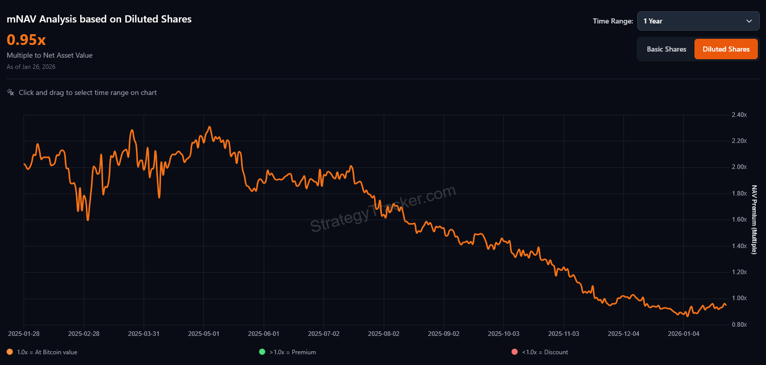 As of January 26, MicroStrategy’s diluted mNAV stands at approximately 0.94x, meaning the stock trades at a 6% discount to the Bitcoin backing each share.