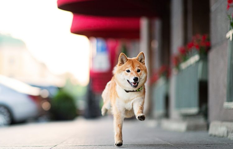 Shiba Inu dog running on a sidewalk.